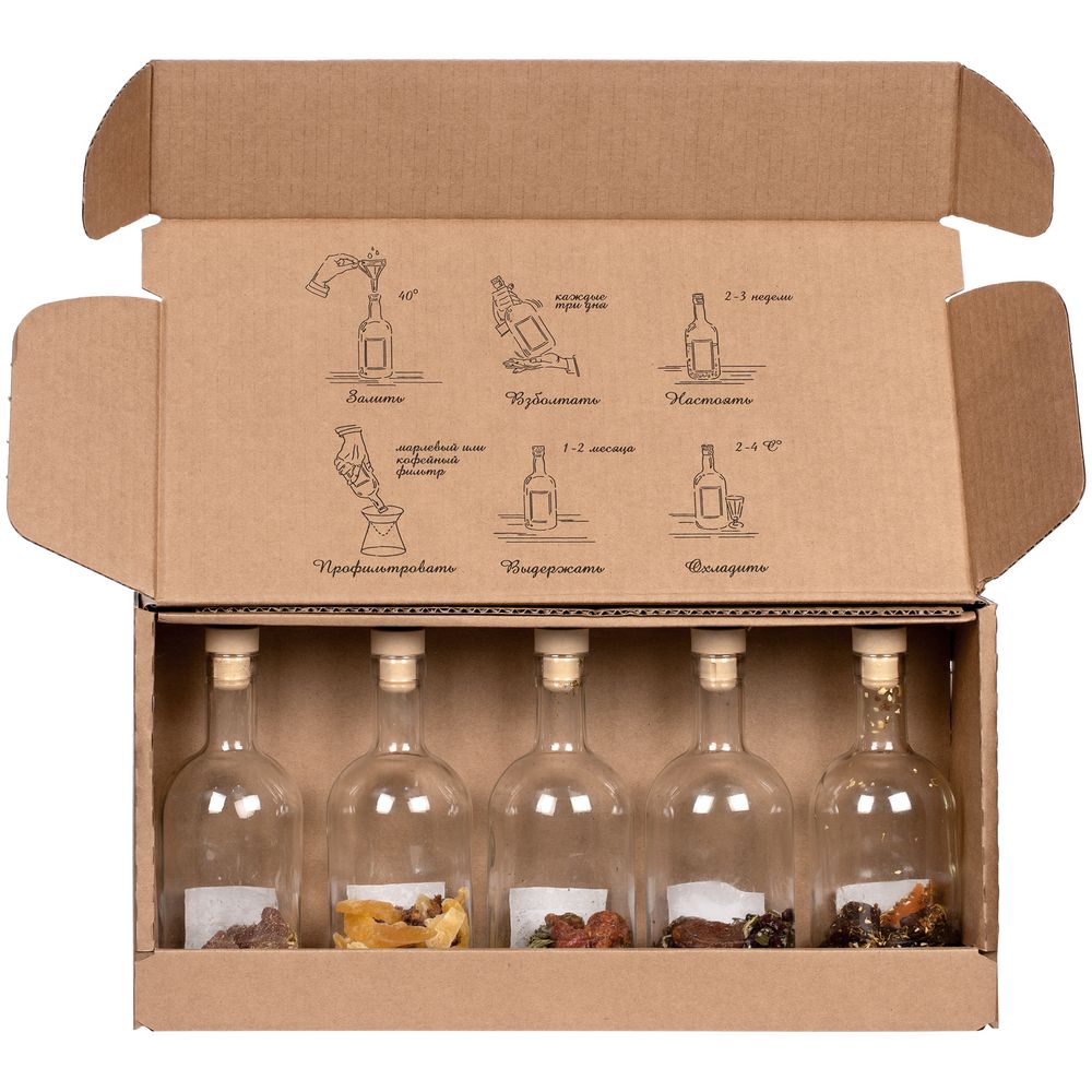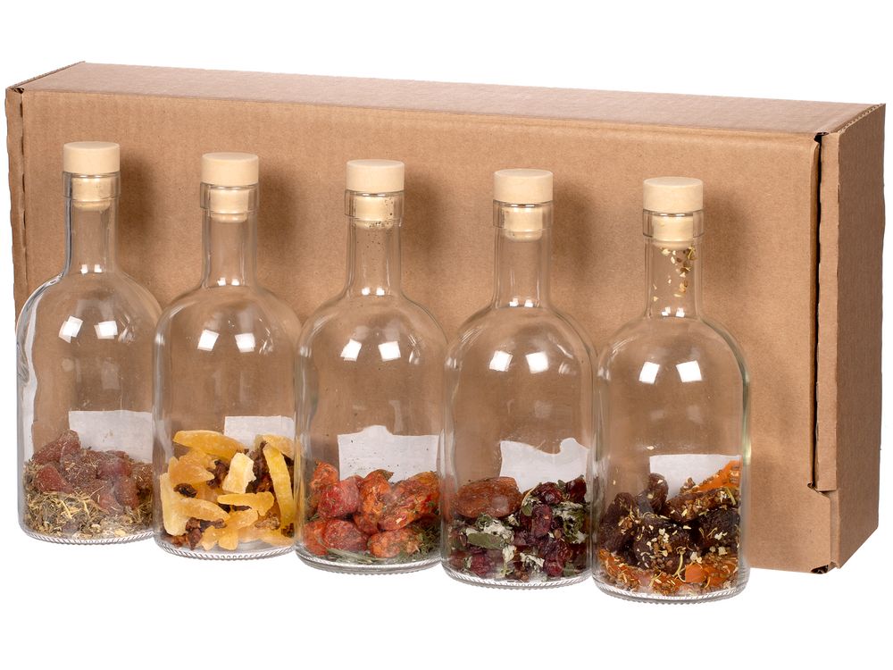 В коллекции набора, вдохновленного русскими сказками и самой природой, 5 бутылок с разными травами, сухофруктами и специями для приготовления сладких или терпких настоек. Одни подействуют как настоящий бальзам на душу, в то время как другие — взбодрят и придадут сил.