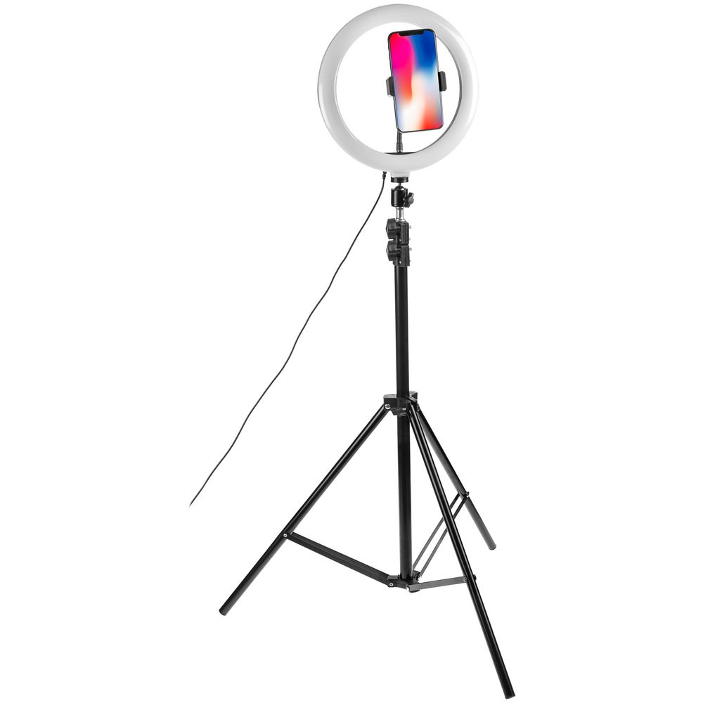 Набор включает штатив и лампу кольцевой подсветки с держателем для смартфона, фотоаппарата или видеокамеры. На лампе можно установить теплый, холодный или смешанный свет и выбрать уровень яркости.