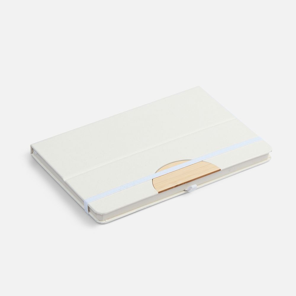 Блокнот из переработанных молочных пакетов, дополнен цветными петлей-резинкой для ручки, белым ляссе и резинкой на обложку.