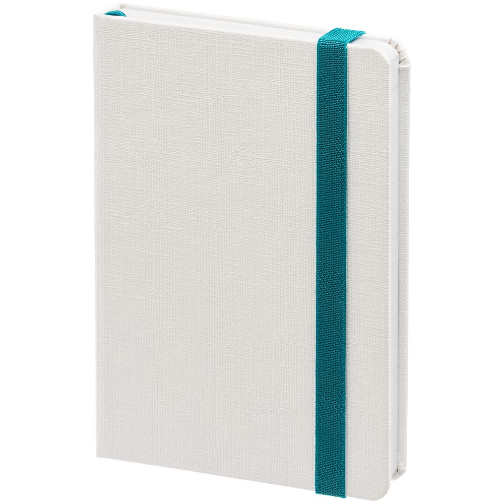Блокнот с твердой обложкой, выполнен из материала Tex, белый. Дополнен цветной резинкой и ляссе.