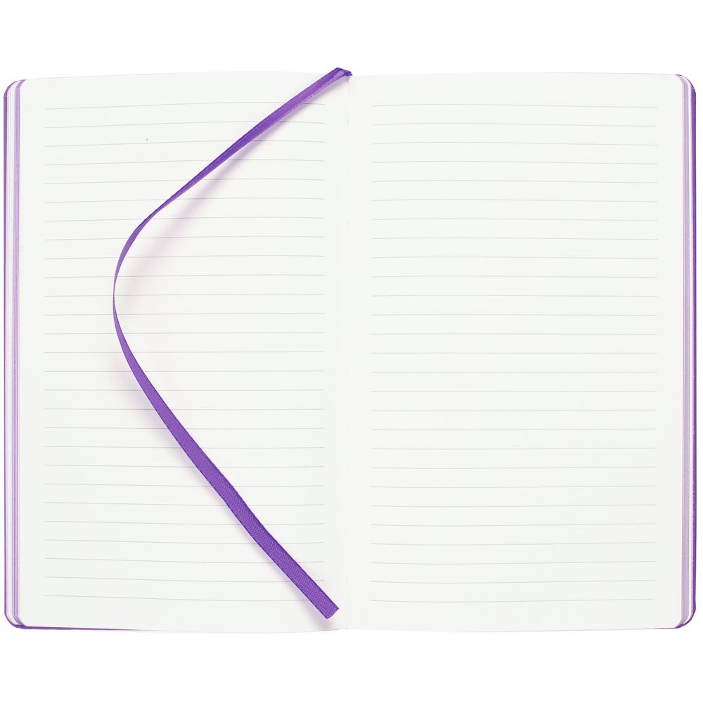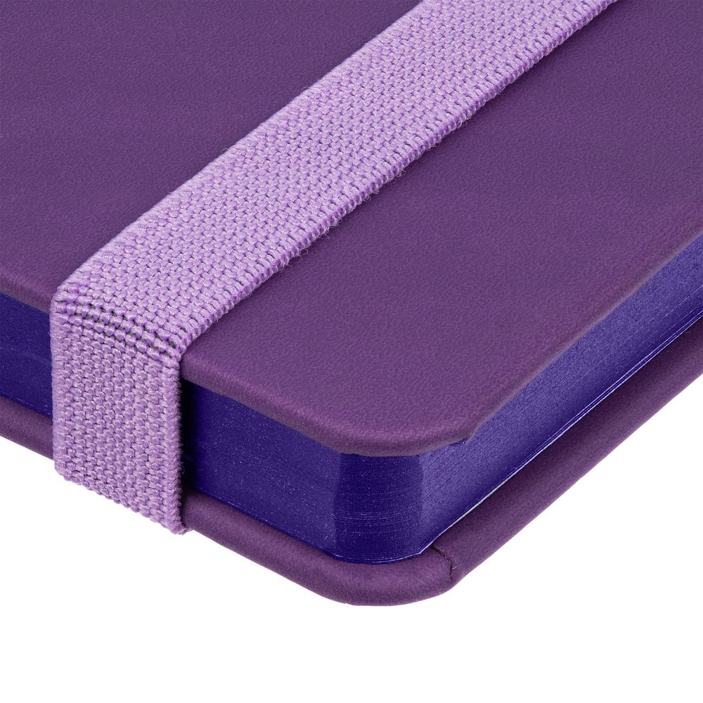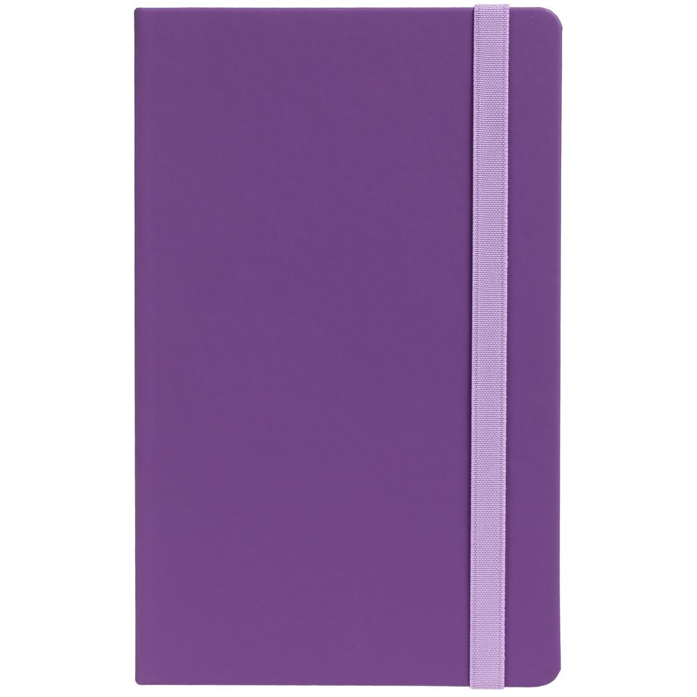 Блокнот в твердой обложке, выполнен из материала Soft Touch, фиолетовый UU, дополнен резинкой и ляссе в цвет обложки.