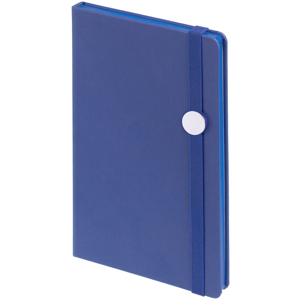 Блокнот в твердой обложке, выполнен из материала Soft Touch Pearl, синий НН, дополнен резинкой и ляссе в цвет обложки.