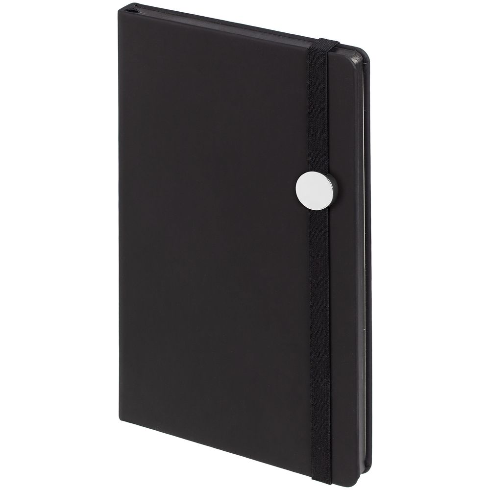 Блокнот в твердой обложке, выполнен из материала Soft Touch, черный АА, дополнен резинкой и ляссе в цвет обложки.