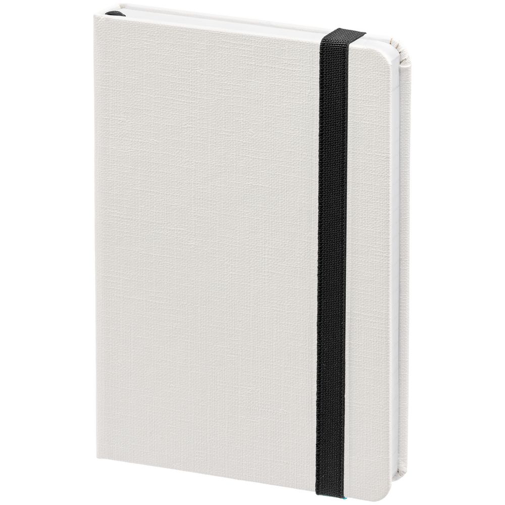 Блокнот с твердой обложкой, выполнен из материала Tex, белый. Дополнен цветной резинкой и ляссе.
