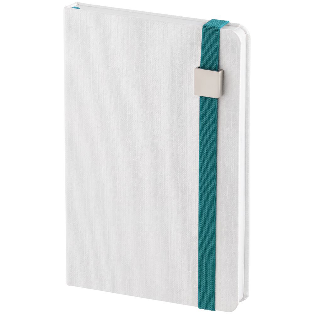 Блокнот с твердой обложкой, выполнен из материала Tex, белый. Дополнен цветной резинкой с металлическим шильдом и ляссе.