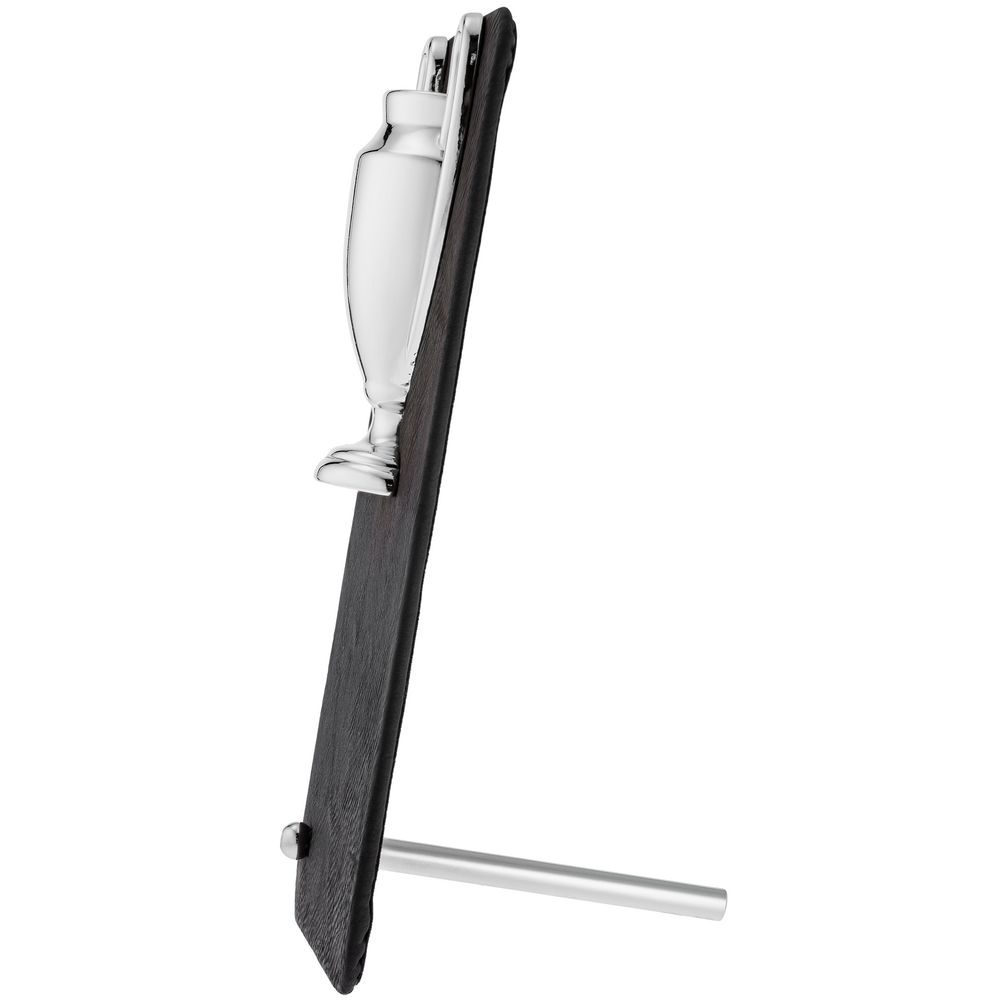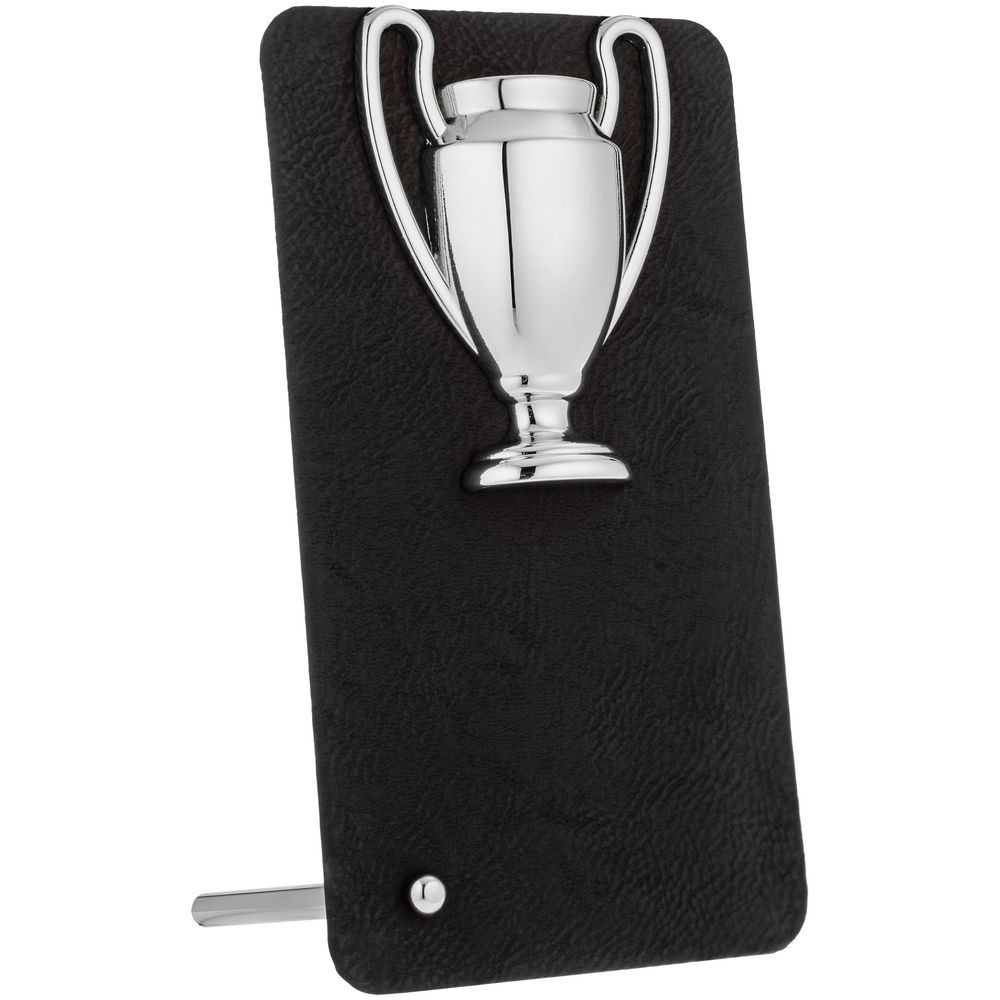 Плакетка, обтянутая искусственной кожей, с глянцевым кубком серебристого цвета.