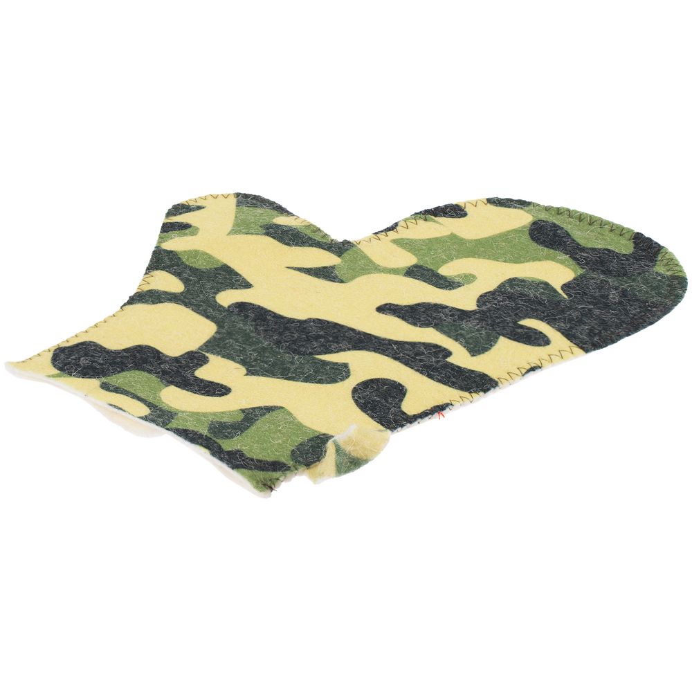 Шапка и рукавица изготовлены из плотного шерстяного войлока с камуфляжным принтом.