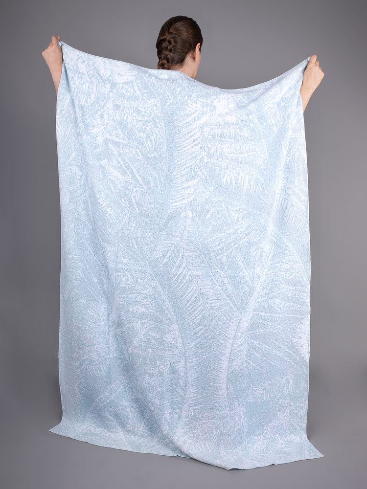 Серебристые и жемчужные оттенки люрекса, добавленные в основной материал, придают узору особую глубину и блеск.